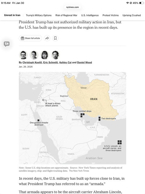 A map was posted this morning on one of the sites I frequent (NY Times), showing where the fleet is currently anchored next to Iran. There’s two destroyers on the east end of the Strait of Hormuz. And what’s going on there? Iran is conducting “live fire exercises” in the strait, warning shipping to avoid the area (play with oil prices? Nah. Existential desperation).