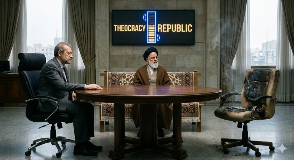 What we know. Khamanei is dead, along with some of his family. Survivors? Larijani is pictured above on the left. The other guy is Ali Reza Alafi, The empty chair is the question: who will succeed Khamanei, a secular or theocrat?